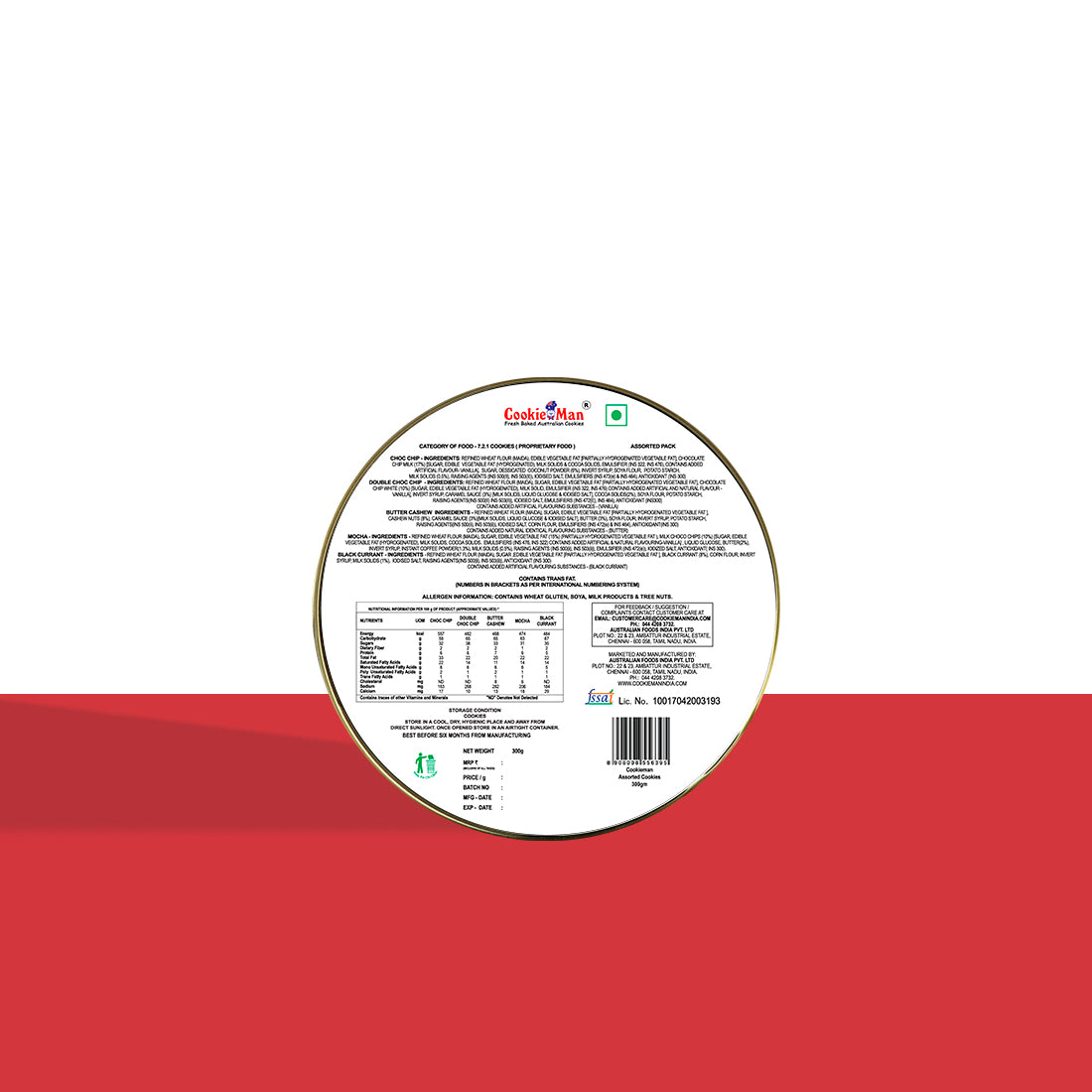Assorted Cookies in a Beautifully Packed tin. Contains of assorted cookies - Choc Chip, Double Choc Chip, Black Currant, Mocha and Butter Cashew.