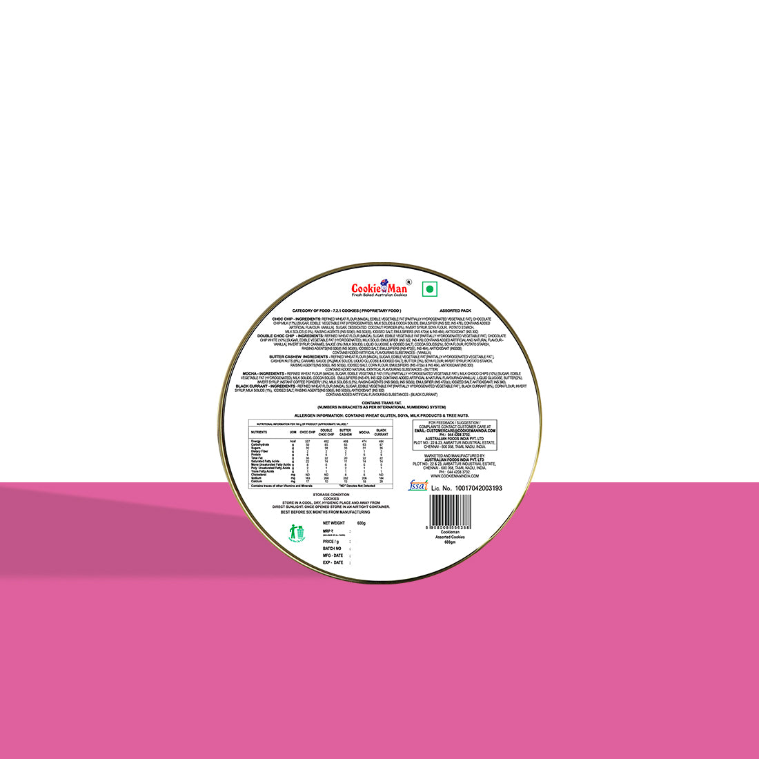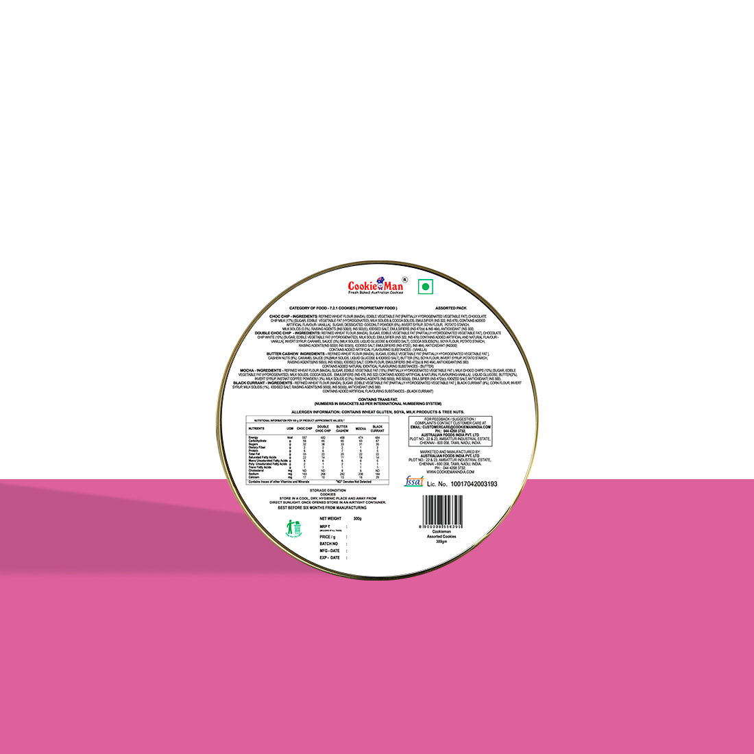 Assorted Cookies in a Beautifully Packed tin. Contains of assorted cookies - Choc Chip, Double Choc Chip, Black Currant, Mocha and Butter Cashew.